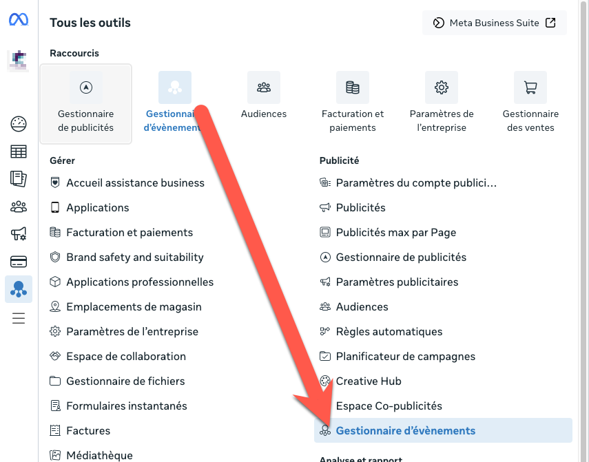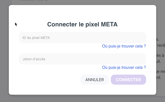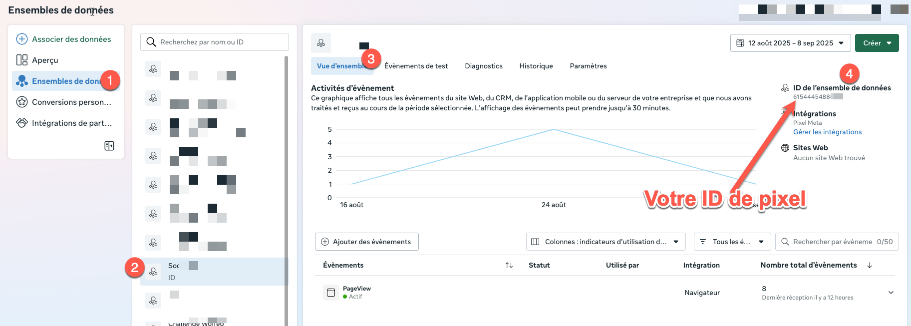 👉 Ces deux informations se trouvent dans votre Meta Business Manager (section Pixels). Vous pouvez consulter l'aide ici.